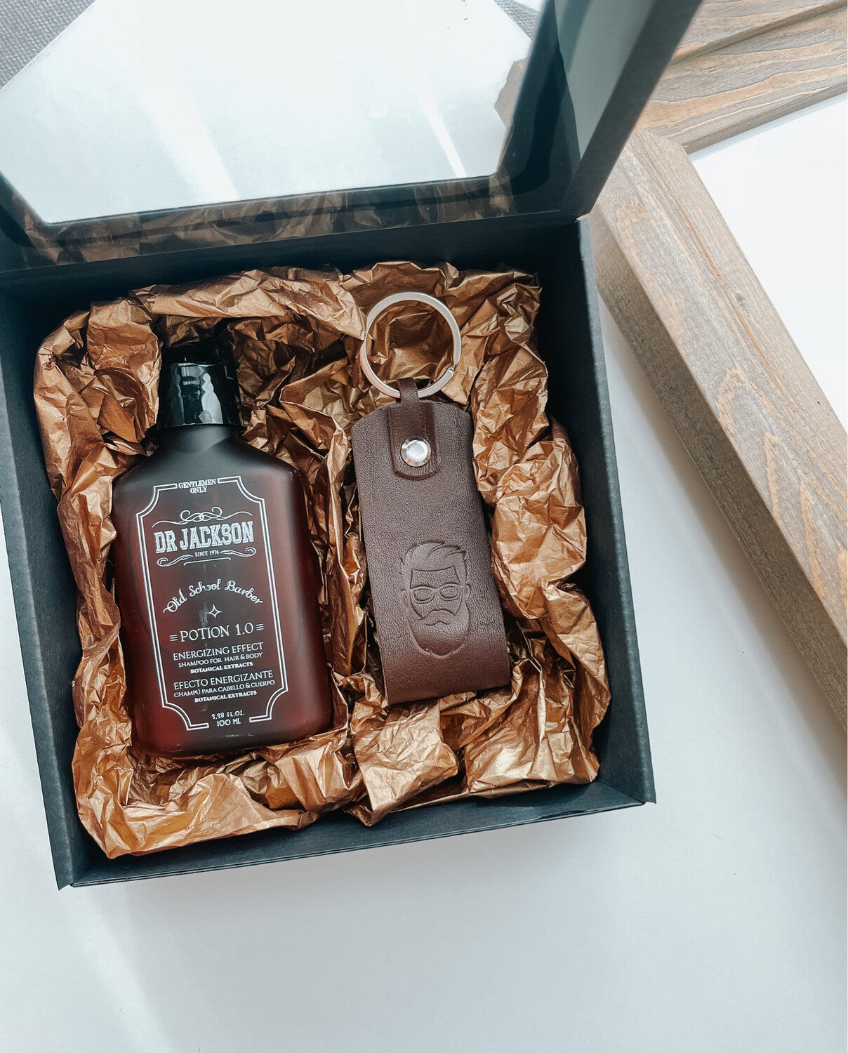 DR JACKSON – tai išskirtinis vyriškų plaukų priežiūros priemonių prekių ženklas. Priemonės skirtos ne tik plaukams puoselėti, bet ir pasirūpinti savo galvos oda bei kūnu. DR JACKSON gaminių linija sukurta visiems vyrams: nuo paauglių iki suaugusiųjų, nes rafinuotas priemonių kvapas tinka visų amžiaus grupių atstovams. DR JACKSON prekių ženklas pasižymi tuo, kad gaminami produktai netestuojami ant gyvūnų, jų sudėtyje nėra alkoholio, parabenų, silicio, glitimo, dažiklių. Be to, ši kosmetika tinka veganams. Jai pagaminti naudojami tik įprasti botaniniai ekstraktai, kurie sustiprina priemonių poveikį ir suteikia norimą galutinį rezultatą. - Natūralios odos rudos spalvos raktų pakabukas su graviruotu įspaudu. Išmatavimai su žiedu: 12x3.5 cm.