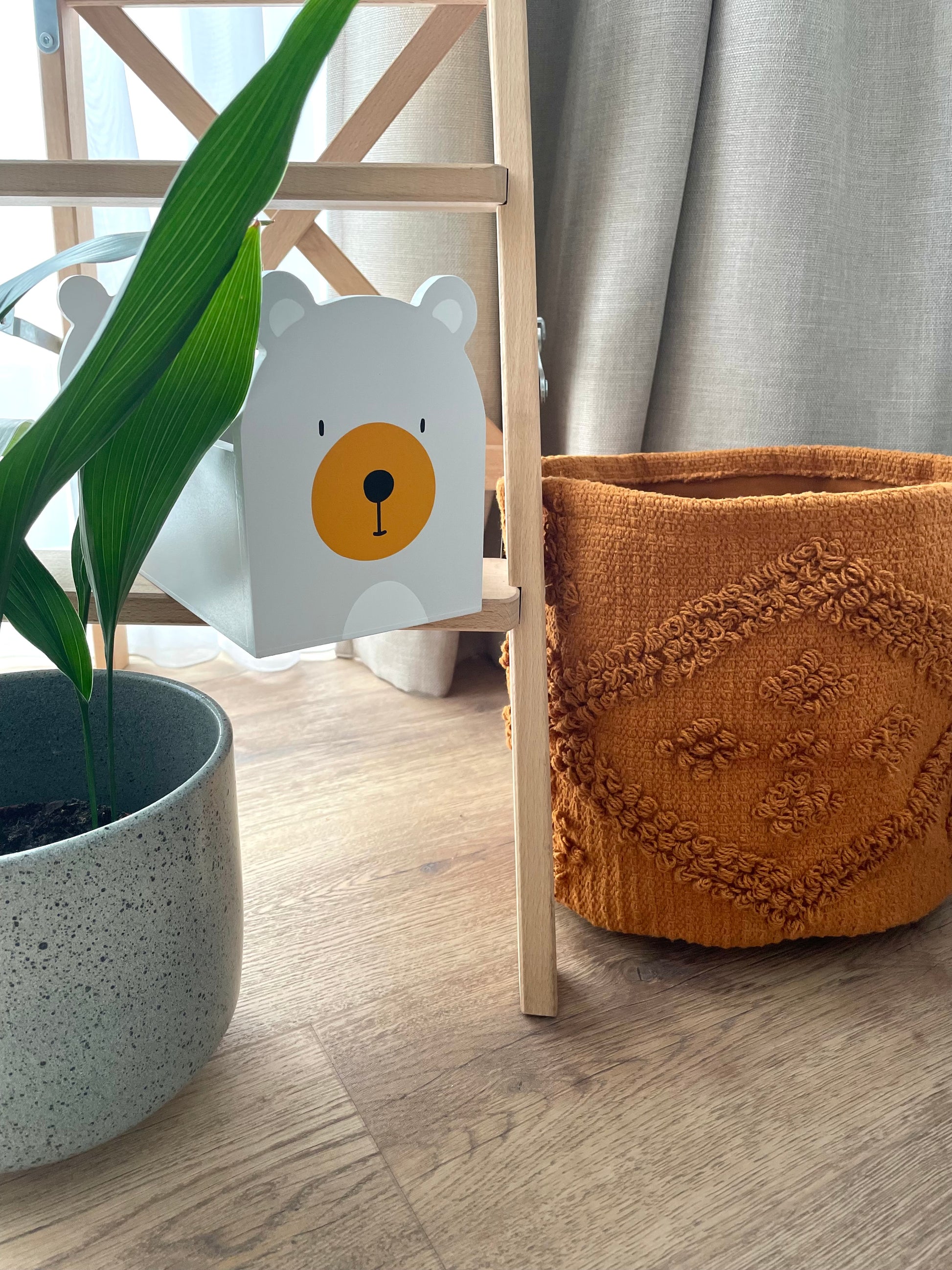 Medžiaginis rudos spalvos daiktų krepšys, standus, laikantis formą.