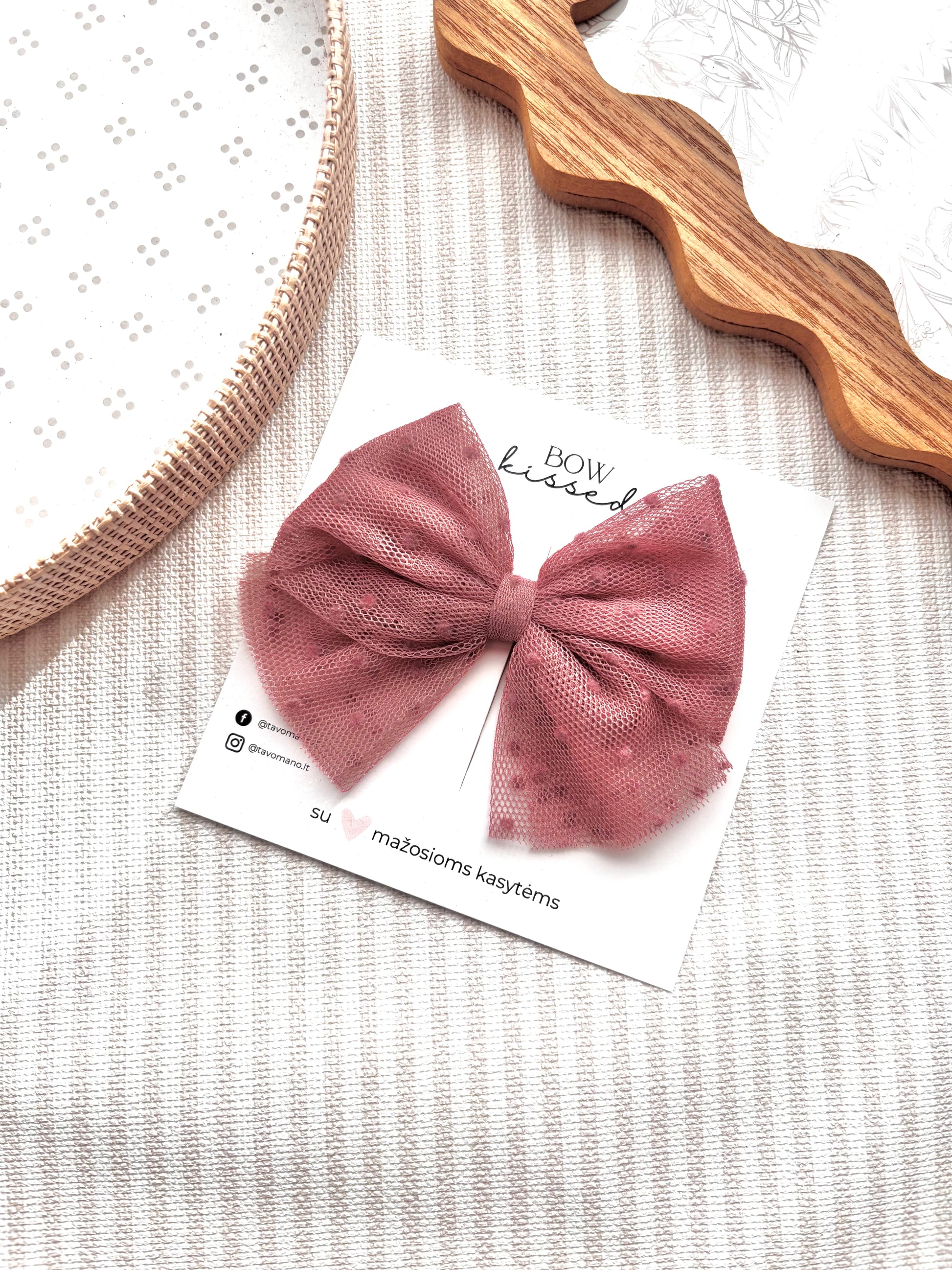 Rankų darbo tamsios rausvos spalvos segtukas dekoruotas aksominiais taškeliais.